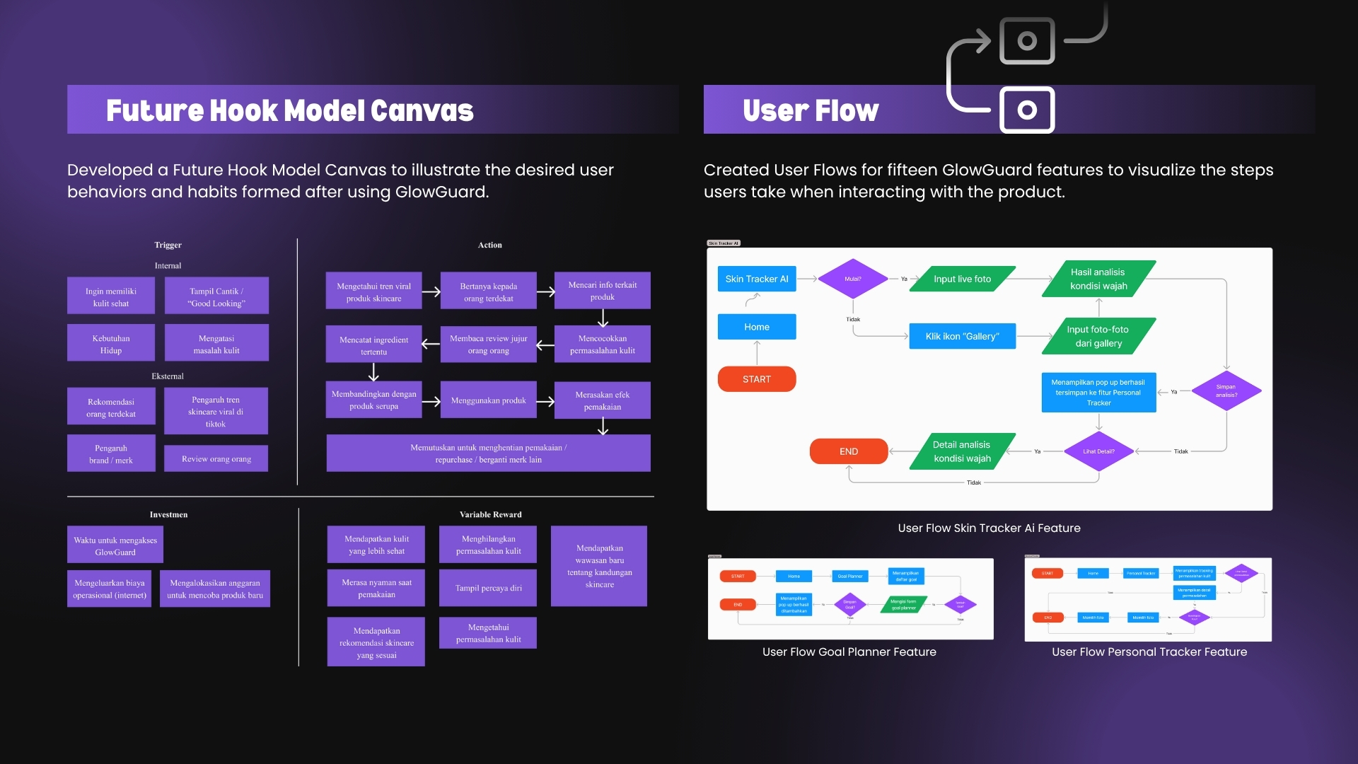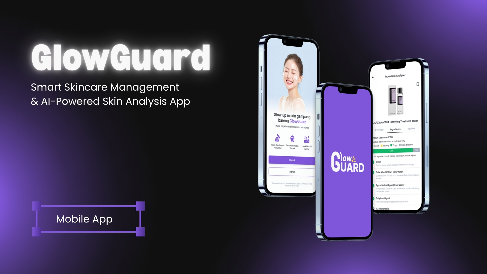 GlowGuard is a mobile app concept designed to educate users about skincare. It offers features like AI-powered skin tracking, personalized recommendations, ingredient analysis, and progress monitoring—all within a clean and intuitive interface.