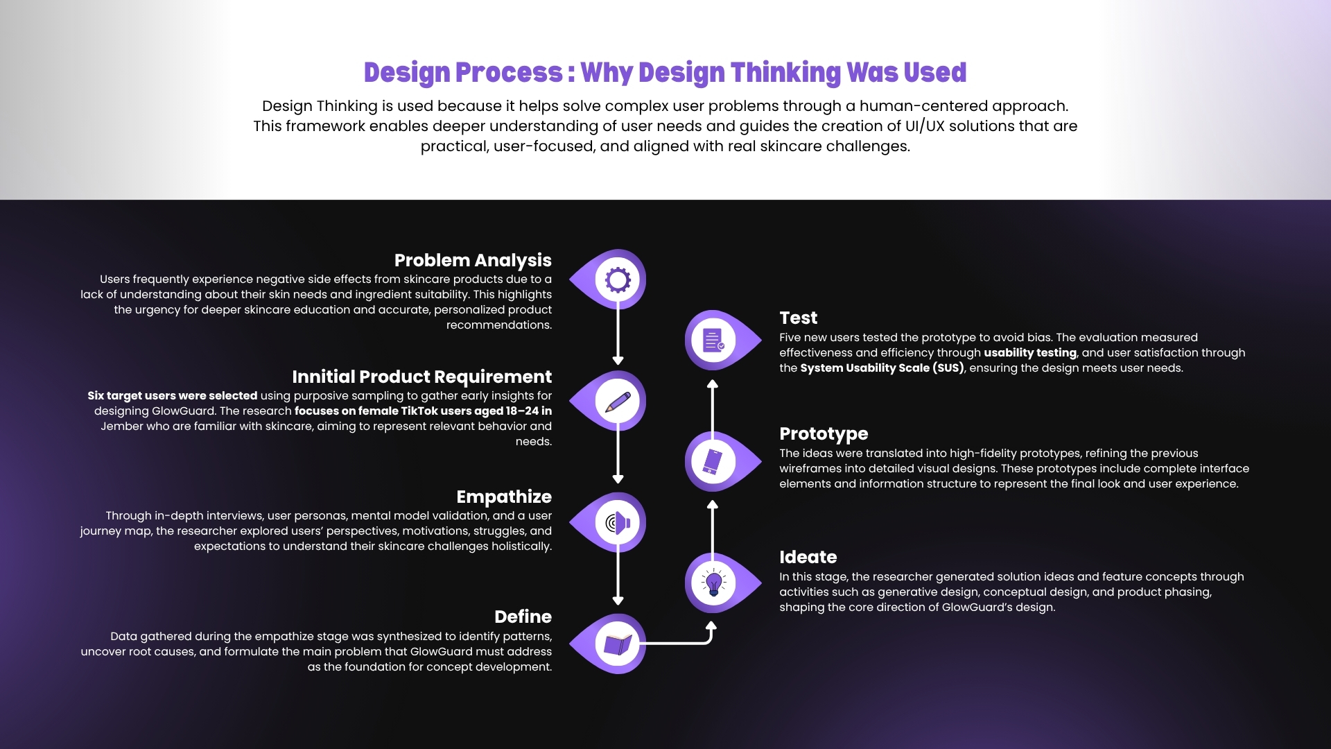 The prototype achieved SUS Grade A, with 100% task success rate and an efficiency score of 5.5% per second. Users found the app easy to use, informative, and helpful in avoiding impulsive, FOMO-driven purchases. This project became a strong foundation for future app development while emphasizing the importance of accessible skincare education.